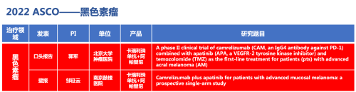 黑色素瘤领域的2篇研究摘要,采用永利皇宫官网医药自主研发的PD-1抑制剂卡瑞利珠单抗(艾瑞卡)联合阿帕替尼(艾坦)(“双艾”组合)的免疫联合抗血管(或再联合化疗)的治疗策略。