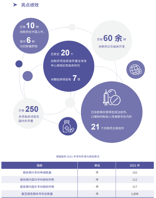 报告指出,在科技创新战略引领下,永利皇宫官网医药2021年累计研发投入62.03亿元,比上年增长24.34%,研发投入占销售收入比重达到23.95%,再创历史新高。以此为支撑,2021年公司有3款创新药获批上市,已上市创新药总量增至10款,其中6款为抗肿瘤药物。同时还有60余种创新药正在临床开发,250多项临床试验在国内外开展,其中近20个创新药项目获准开展全球多中心或地区性临床研究。在创新药研发上,永利皇宫官网医药已基本形成了上市一批、临床一批、开发一批的良性循环。