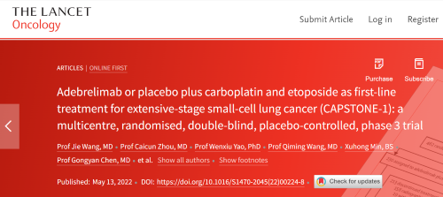 北京时间2022年5月14日,永利皇宫官网医药自主研发的PD-L1抑制剂阿得贝利单抗治疗广泛期小细胞肺癌的III期临床研究(CAPSTONE-1研究)成果正式全文在线发表于国际权威学术期刊《柳叶刀·肿瘤学》(《THE LANCET Oncology》,影响因子41.316)。CAPSTONE-1研究结果显示,阿得贝利单抗联合化疗一线治疗广泛期小细胞肺癌相较于安慰剂联合化疗可以显著延长患者总生存期至15.3个月[1],刷新现有免疫药物一线治疗广泛期小细胞肺癌的总生存纪录[2]