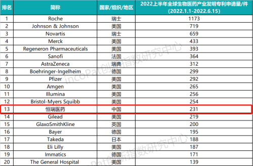 专利是药企最有价值的资产之一,是企业发展的基石,对做原创创新的企业尤为重要。全球专利数据库incoPat创新指数研究中心对2022年1月1日至2022年6月15日公开的全球生物医药产业发明专利申请数量进行统计排名,生物医药产业专利涉及生物技术药、基因工程药物、疫苗、诊断试剂、微生态制剂、血液制品等技术领域。入榜企业/医院主要来自13个国家、组织或地区,罗氏、强生、诺华分别位列前三,永利皇宫官网医药(231件)排名第13位,领跑中国药企。